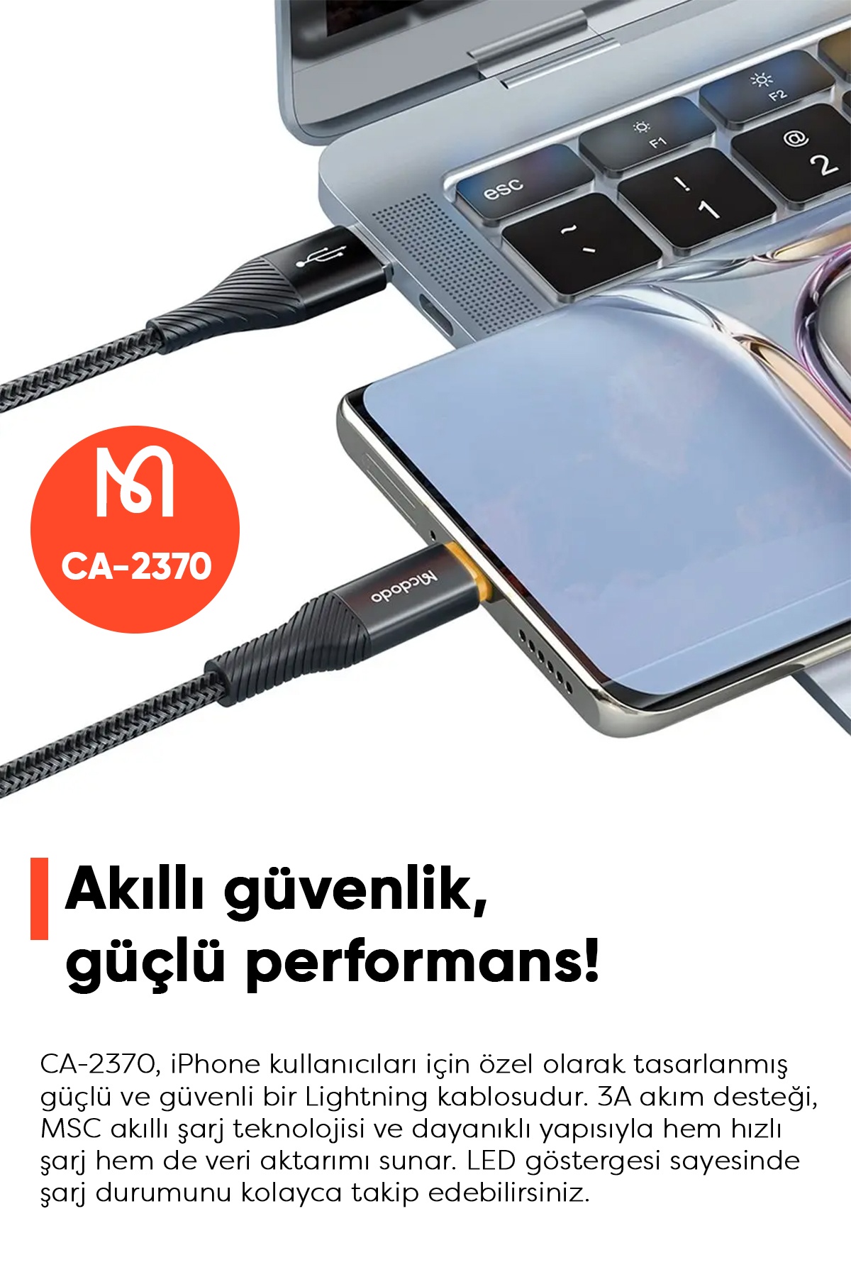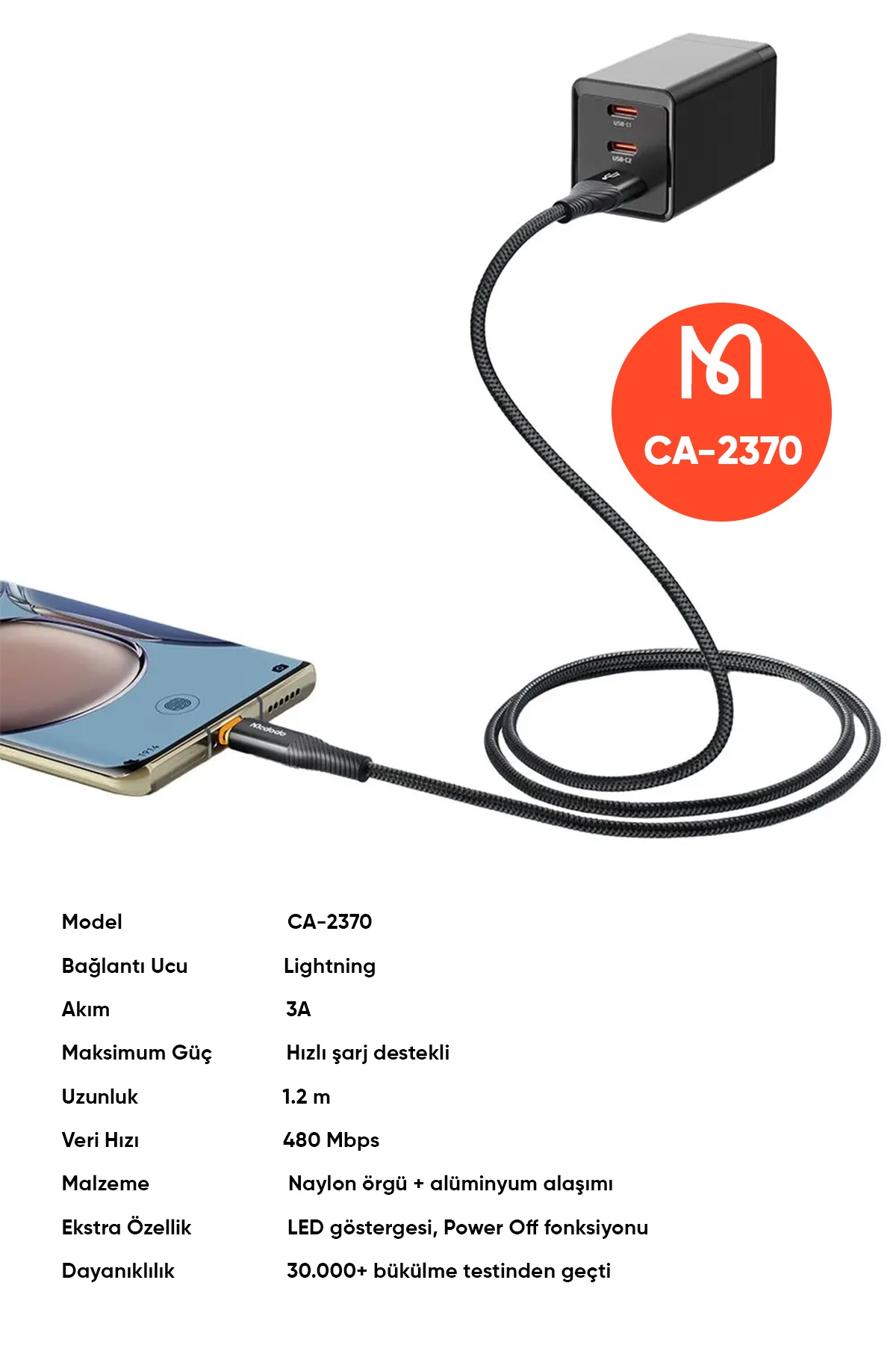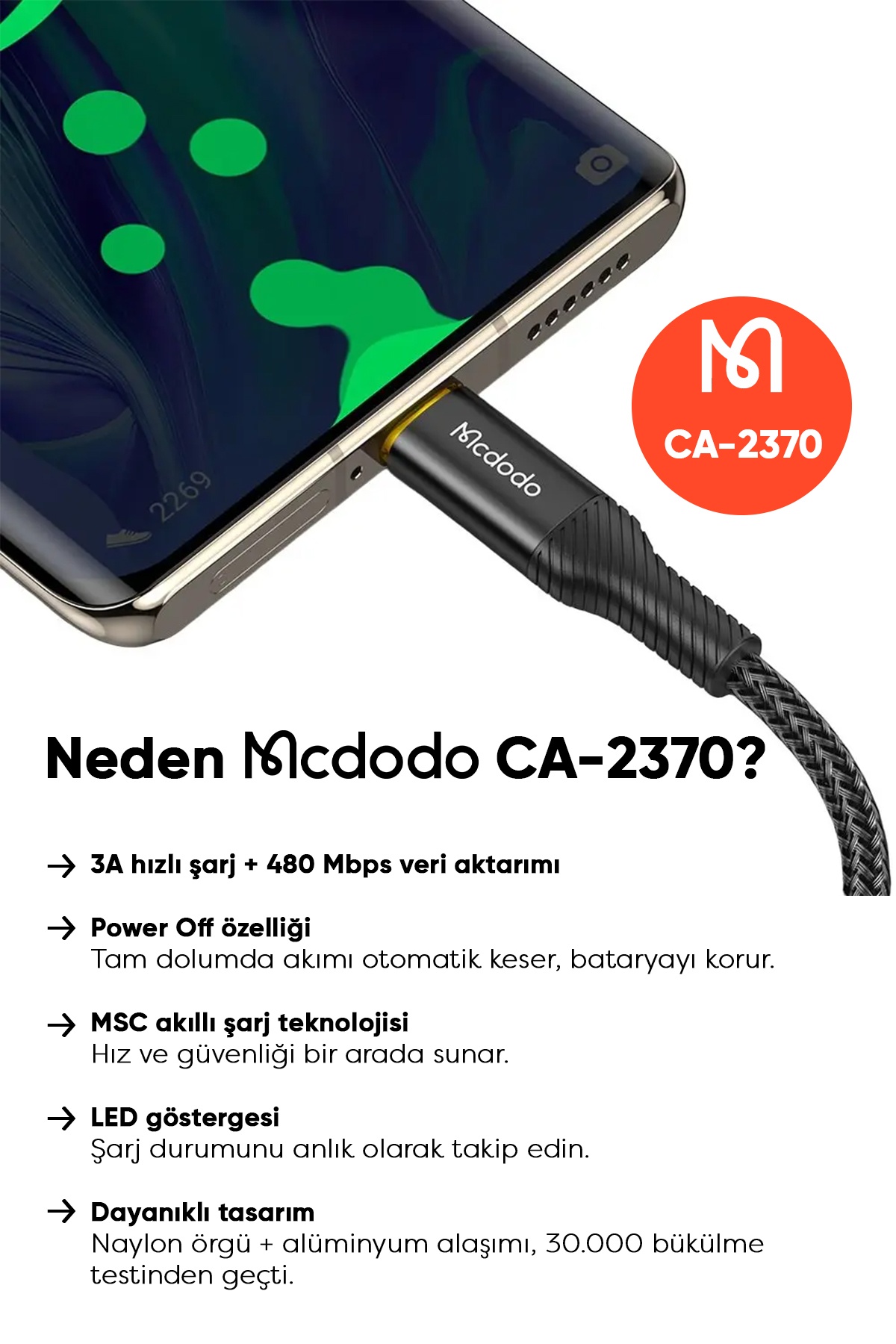 Sonuç: Mcdodo CA-2370, hem şık tasarımı hem de yüksek performansıyla, akıllı telefon kullanıcıları için vazgeçilmez bir yardımcıdır. Güçlü, dayanıklı ve güvenli olan bu kablo ile teknolojinin tadını çıkarın.