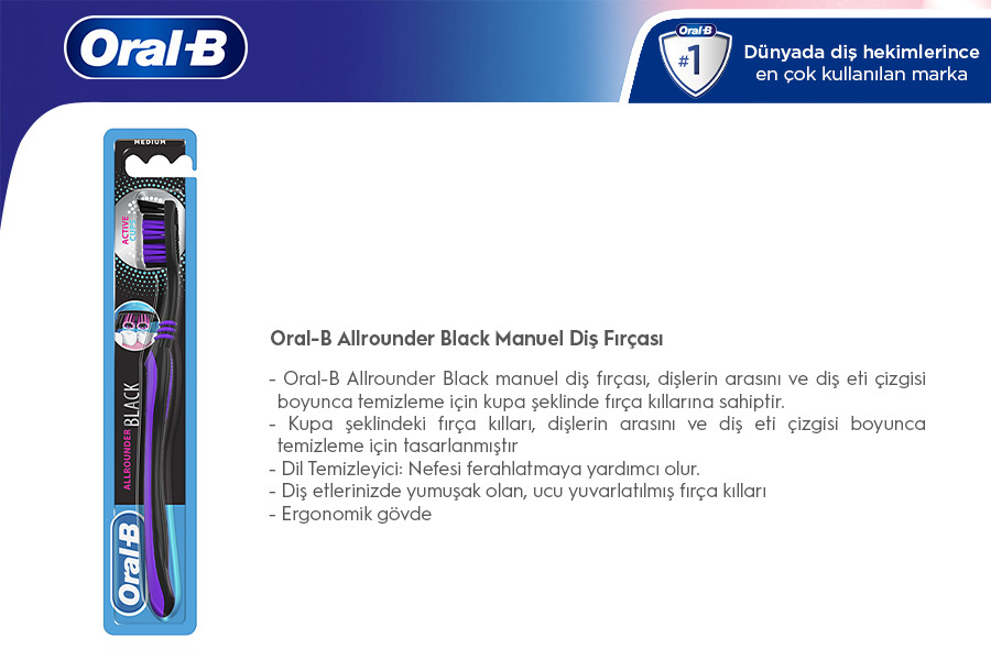 Oral B Allrounder Black manuel diş fırçası, dişlerin arasını ve diş eti çizgisi boyunca temizleme için kupa şeklinde fırça kıllarına sahiptir. Kupa şeklindeki fırça kılları, dişlerin arasını ve diş eti çizgisi boyunca temizleme için tasarlanmıştır Dil Temizleyici: Nefesi Ferahlatmaya Yardımcı Olur Diş etlerinizde yumuşak olan, ucu yuvarlatılmış fırça kılları Ergonomik gövde