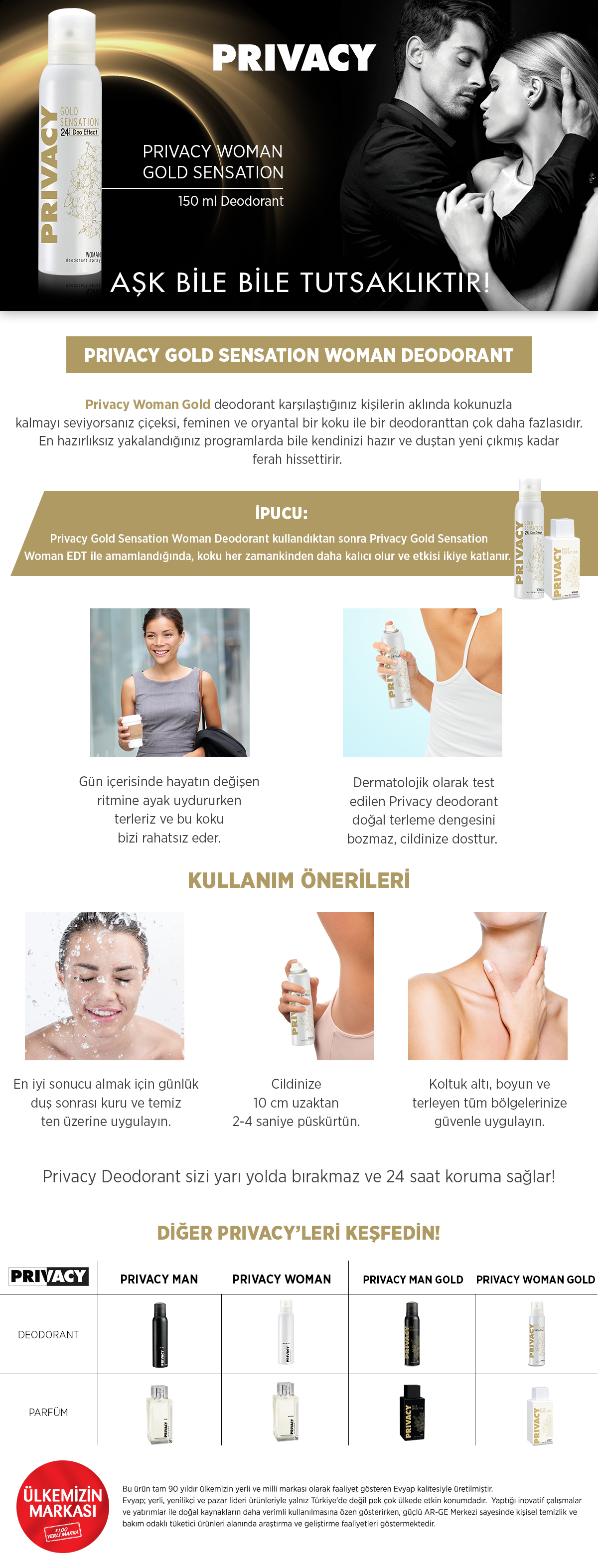 Privacy EDT parfümler dikkat çekici notaları ve kalıcı etkisiyle gün boyu hissedilir. Privacy deodorantlar özel formulü sayesinde ter kokusuna karşı 24 saat korur.