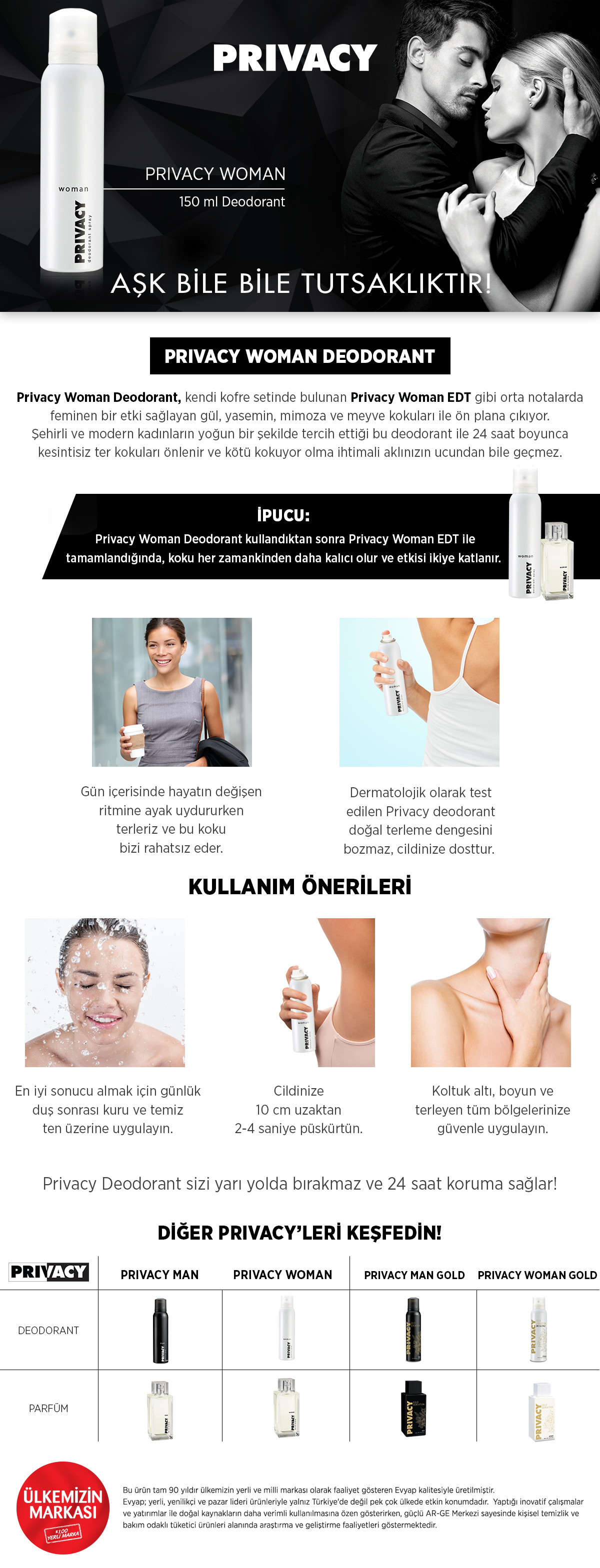 Privacy EDT parfümler dikkat çekici notaları ve kalıcı etkisiyle gün boyu hissedilir. Privacy deodorantlar özel formulü sayesinde ter kokusuna karşı 24 saat korur.